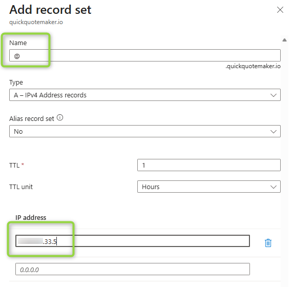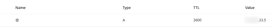 To display my website, the first record to create in Azure DNS is an A record pointing to the public IP address of my website provided by OVH.